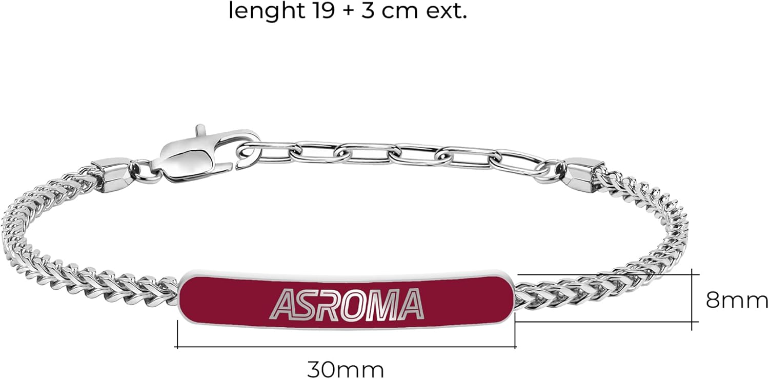 Wear your passion for football in style with the official AS Roma stainless steel bracelets designed for true fans who want to stand out with a stylish, modern and durable accessory. Each bracelet is made of hypoallergenic stainless steel, which ensures durability, shine and comfort even with everyday wear. The design is enriched by the As Roma logo and details in Giallorosso, the symbolic colours of the Romanist team. The collection offers 6 different designs, suitable for every style: classic chains, knitted links, enamel plates and variants with decorative inserts. Perfect for wearing on any occasion, from leisure to special events. These bracelets also make an ideal gift idea for friends, family and AS Roma fans - they arrive carefully packaged and ready to surprise. Always carry your football faith with you and proudly show your belonging to the great Romanist family.